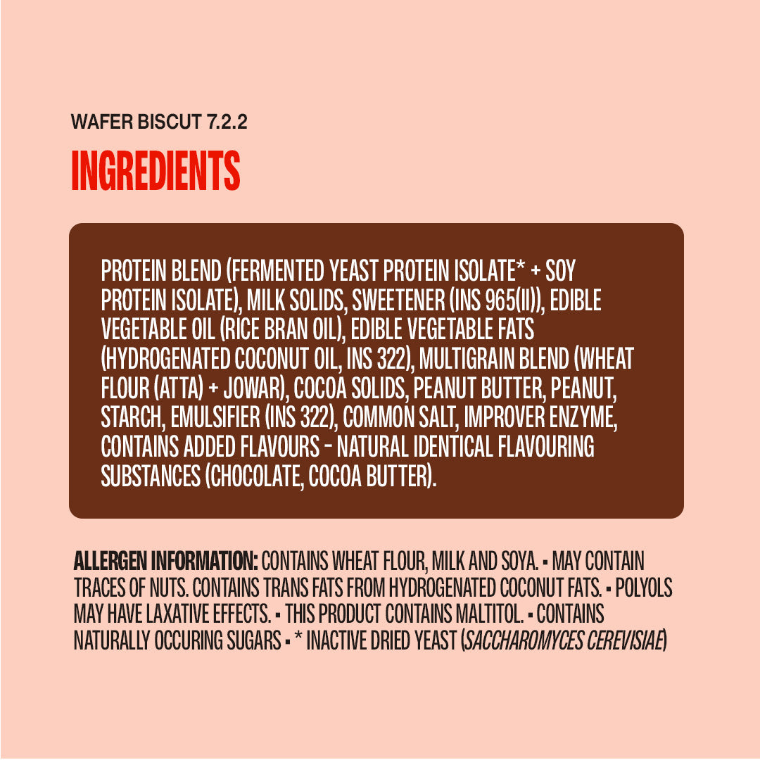 High-protein bar with 20g protein per serving - layered crispy chocolate wafers with salted peanuts. Made with atta and jowar, no added sugar, no palm oil.