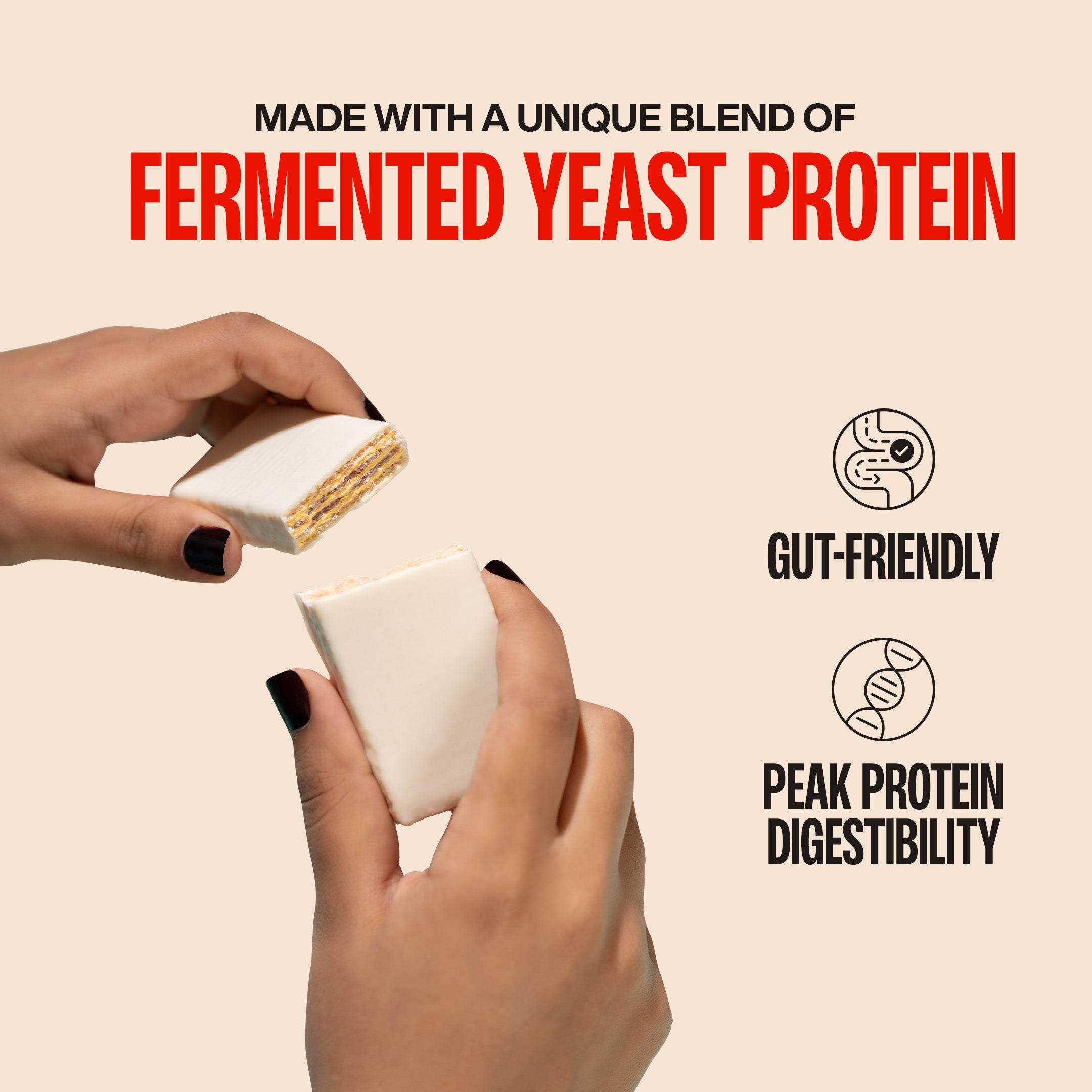 Creamy vanilla and cocoa layered protein wafers made with atta and jowar. 10g protein, 3g fibre, no added sugar and no palm oil.