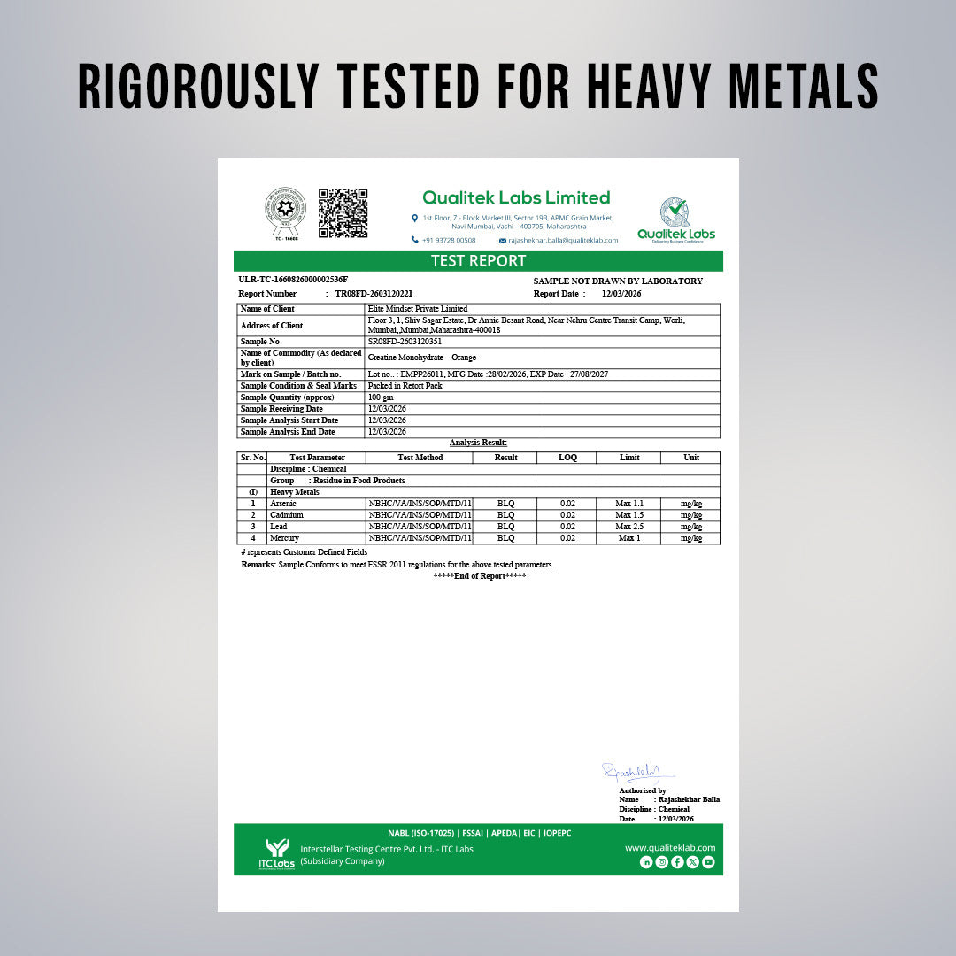 Pharma-grade creatine monohydrate micronised to 200 mesh with added probiotics. Zero calories, zero sugar, refreshing orange flavour.