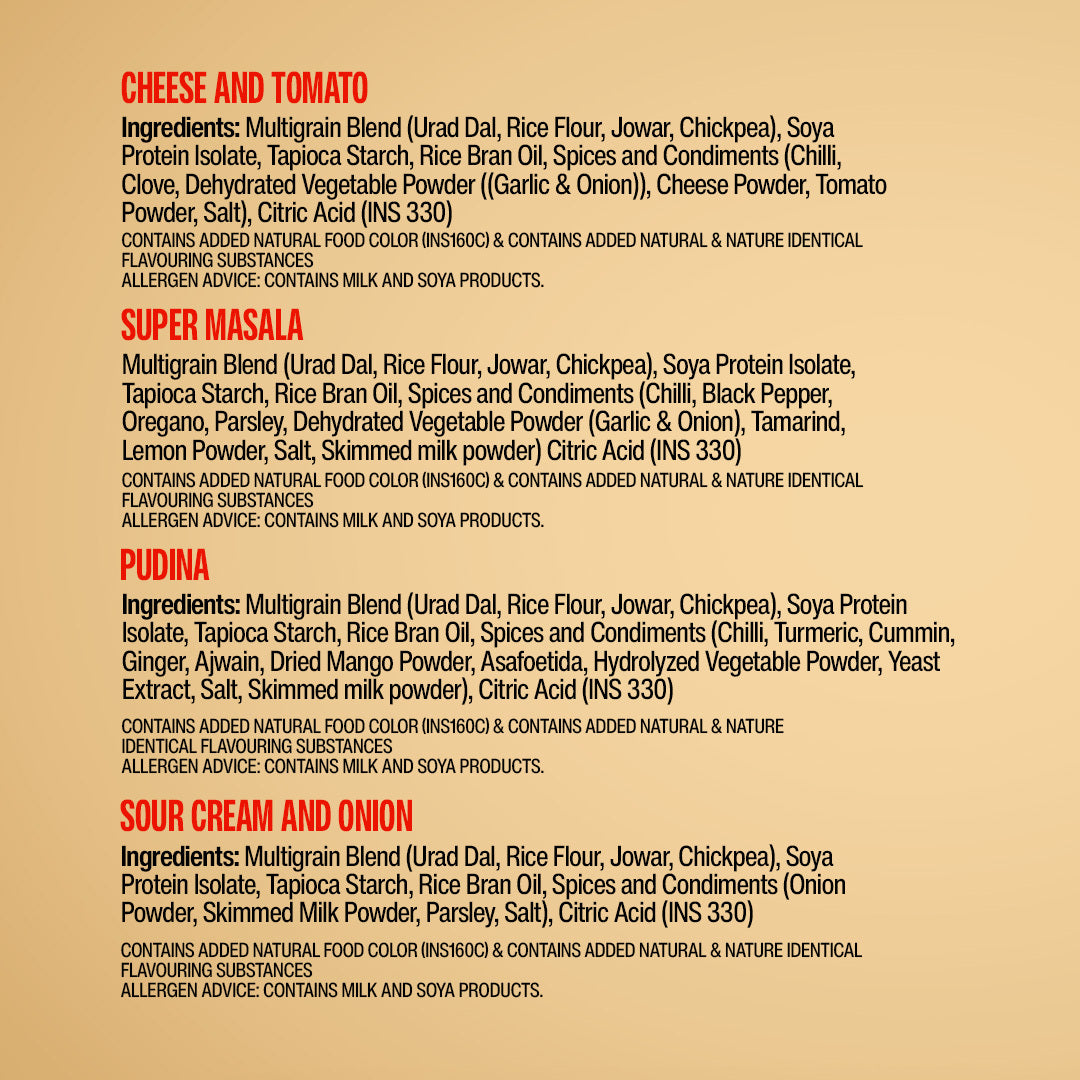 flavorsCheese & Tomato, Sour Cream & Onion, Super Masala, Pudina