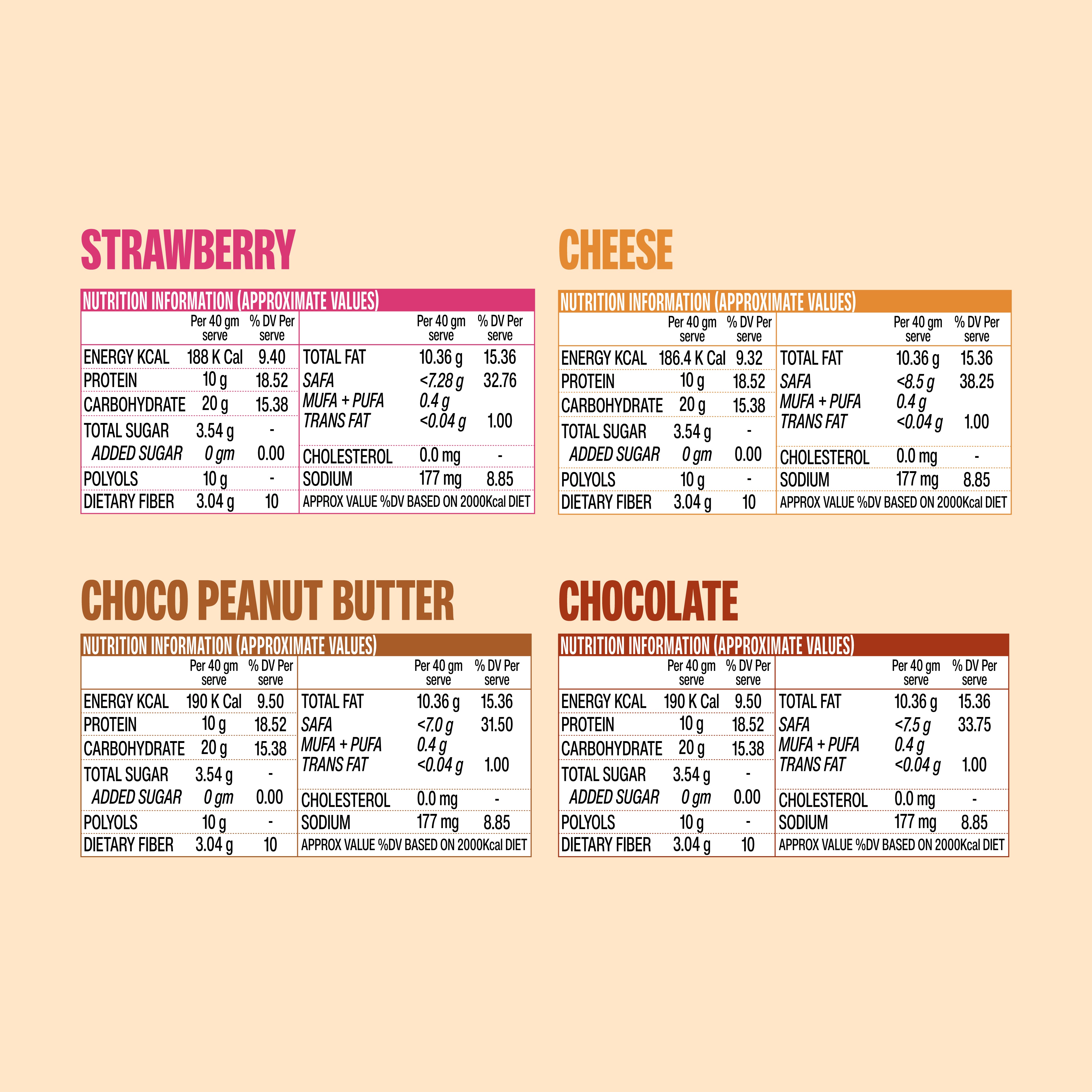flavorsChocolate, Choco Peanut Butter, Strawberry Creme, Cheese